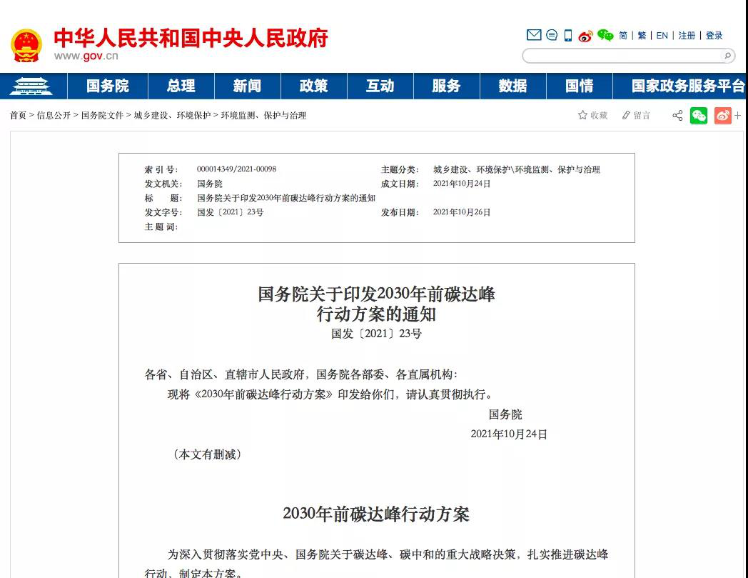 國務(wù)院關(guān)于印發(fā)2030年前碳達峰行動(dòng)方案的通知